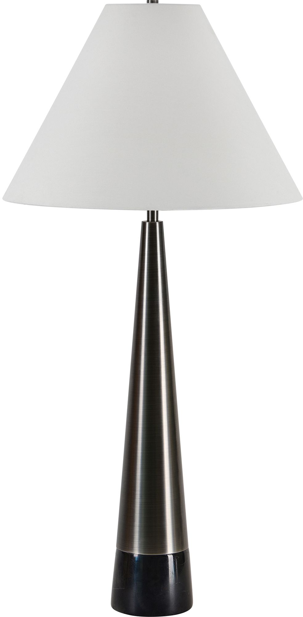 Classique au dessus et nouveau monde en dessous, cette lampe de table prouve qu'on gagne à se distinguer. Avec une base en marbre et en fer plaqué étain et nickel satiné et un abat-jour en coton blanc cassé, cette lampe ne fait que briller.Read More