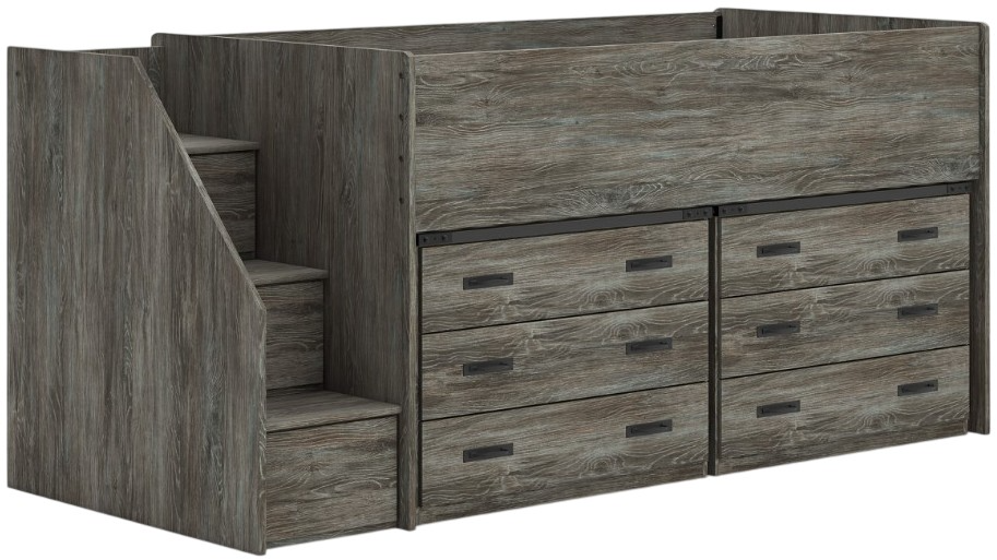 Comprend un lit mezzanine, des marches de rangement à gauche avec extrémités de mezzanine, des lattes à roulettes et un tiroir de rangement sous la mezzanine.